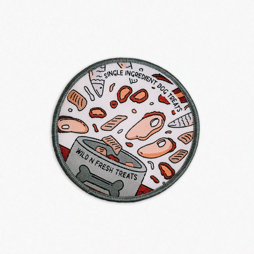 This velcro patch features some of our favorite treats (GLM, sardines, pollock fillet chips, duck wing) falling into a WnF bowl.