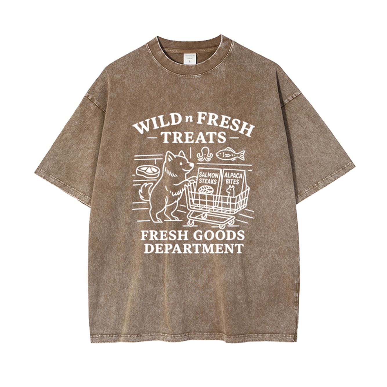 Meet your new favorite tee from the Fresh Goods Department—designed for dog lovers who like to keep it casual and cool. This unisex acid wash t-shirt in a unique sand tone features a playful front graphic of a dog shopping for salmon steaks and alpaca bites, showcasing our Wild n Fresh treats in style.