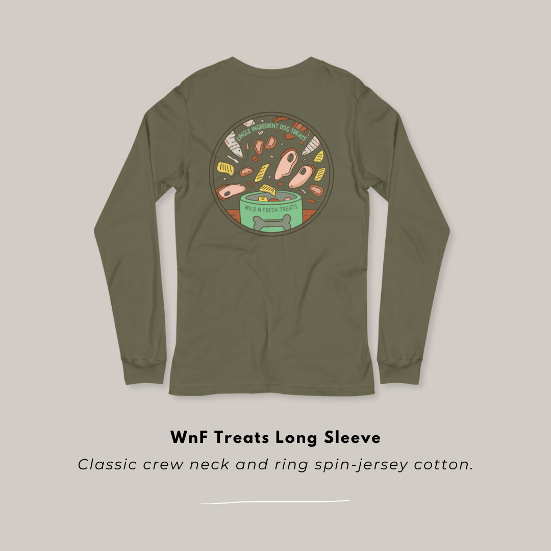 The front of the shirt features our logo in a green color. The back of the shirt has a custom design, illustrating some of our favorite treats (GLM, sardines, pollock fillet chips, duck wing) falling into a WnF bowl. The long sleeves features a classic crew neck and ring spin-jersey cotton, perfect for fall weather. In addition, the graphic will be printed with water-based ink, making them more eco-friendly.