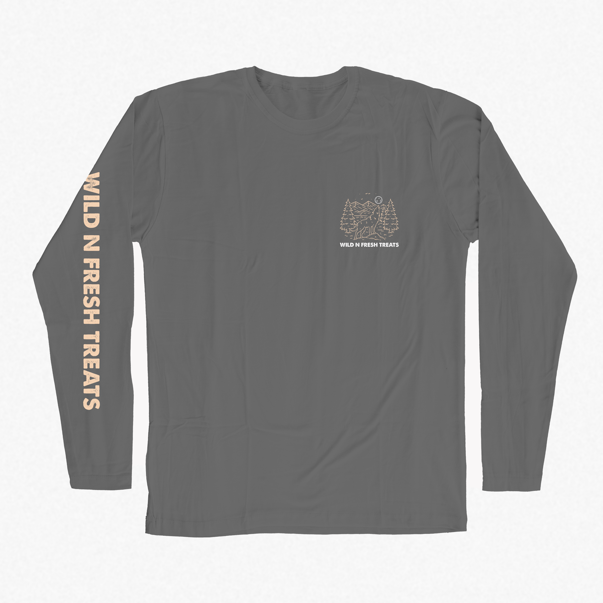 Our pocket long sleeve draws inspiration from the great outdoors, a beloved setting for many of our reps. The design showcases a striking scene, with a prominent wolf howling in the foreground, while in the background, you'll find a picturesque landscape of trees, mountains, meadows, and sky.