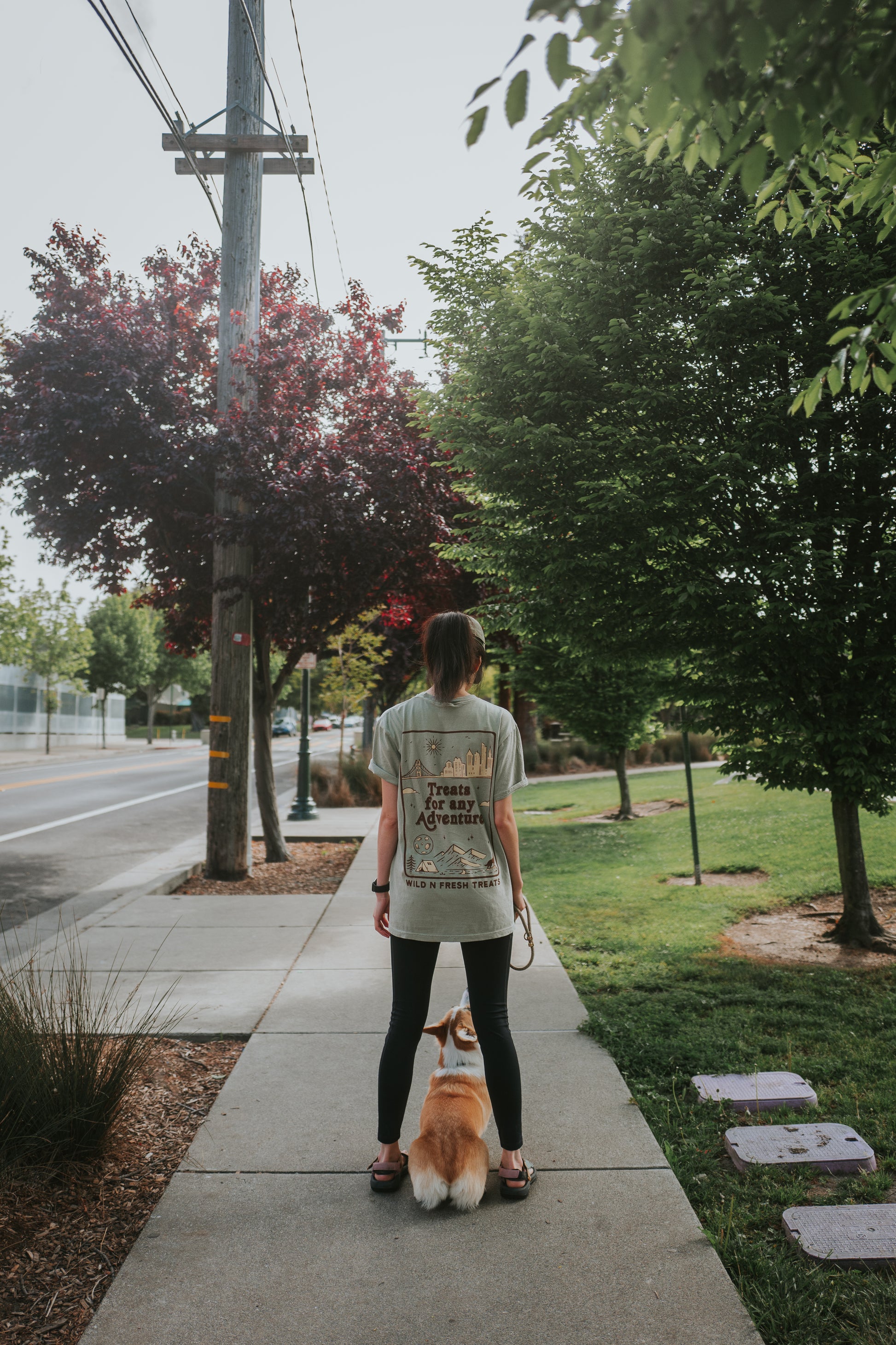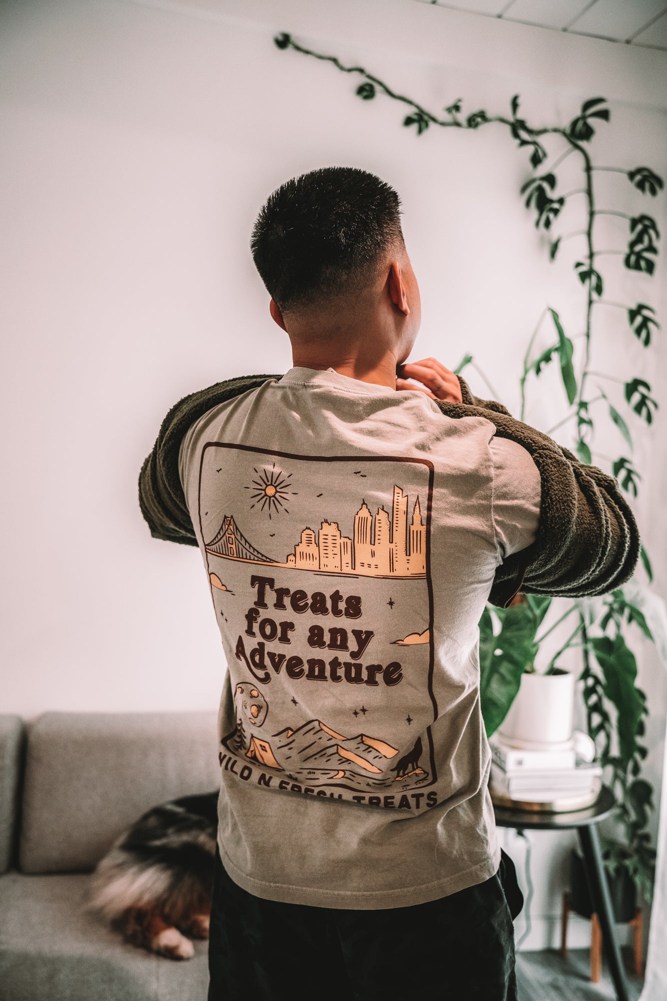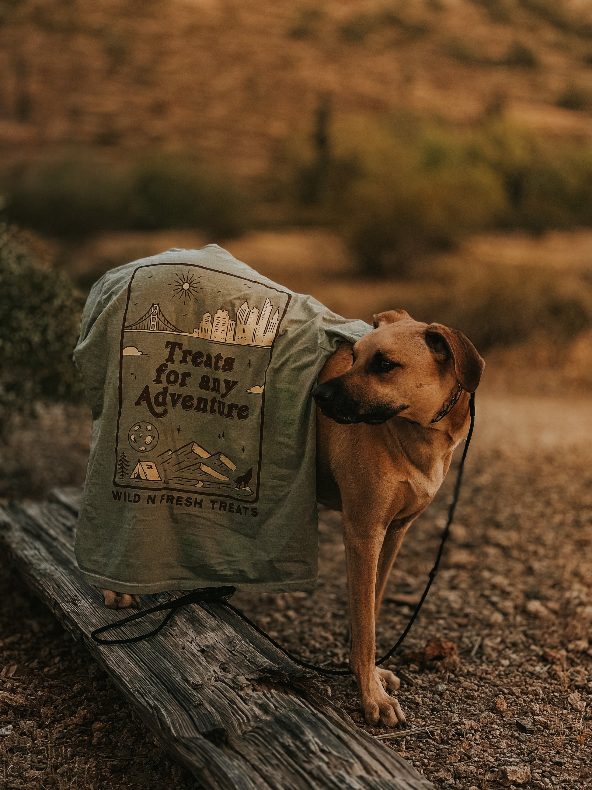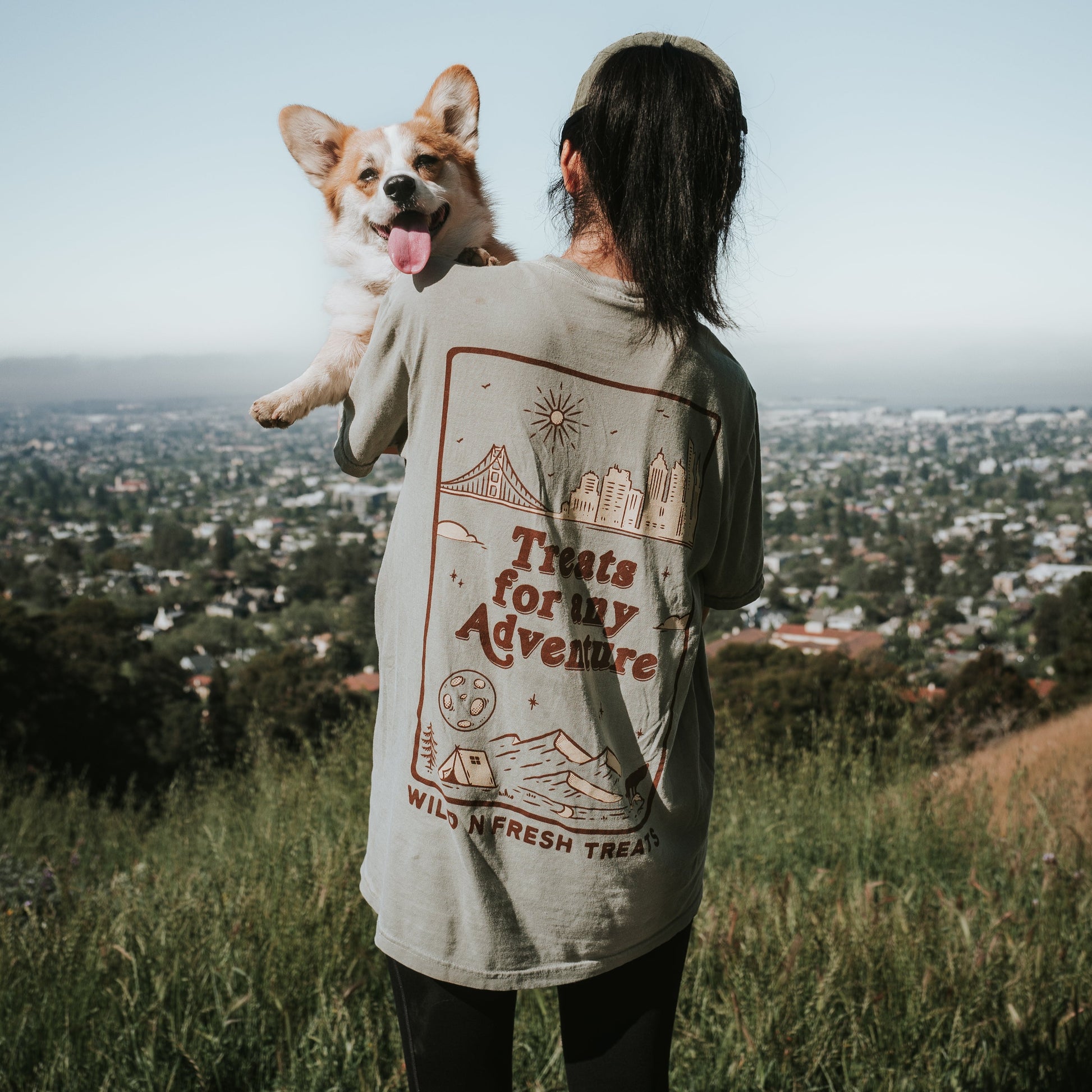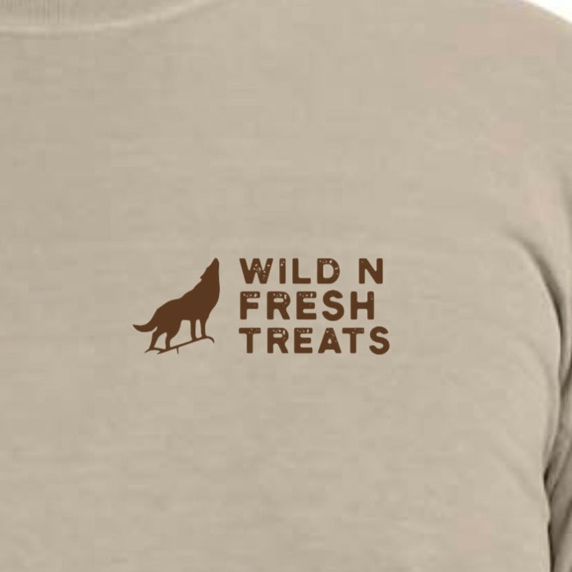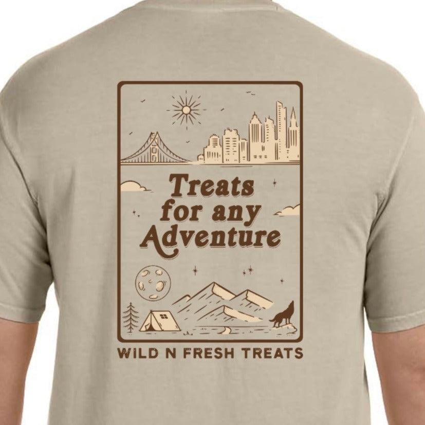 In the front, our logo icon is in the top left with "Wild n Fresh Treats" text on the right of the icon. The graphic printed on the back features city landscape on the top and camping in nature scenery on the bottom. In the middle, there is text "Treats for any Adventure."